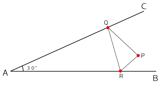 いま、まず∠CABの内部に点Pをとります。次に、点Q,Rを、△PQRの周の長さが最も小さくなるように、半直線AC、AB上にとります。