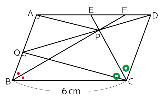 いま、∠Bのの二等分線BFと、∠Cの二等分線CEの交点をPとします。また、DPの延長と辺ABの交点をQとしたところ、∠CQB=90°になりました。さらに、頂点AとPを結んだところ、∠PAB=90°となりました。