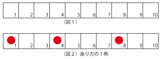 横1列に並んだ10個の座席があります。この座席に何人かが座ることにしますが、以下のようなルールがあります。